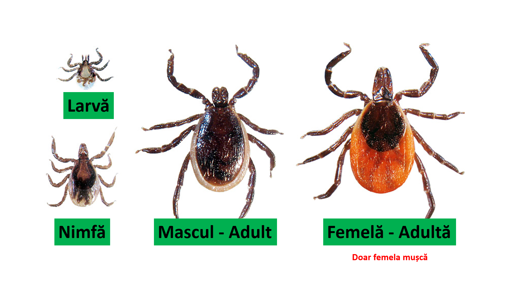 • Ouă – larve – nimfă – căpușă adultă. Doar nimfa și căpușa adultă (femela) poate să muște.