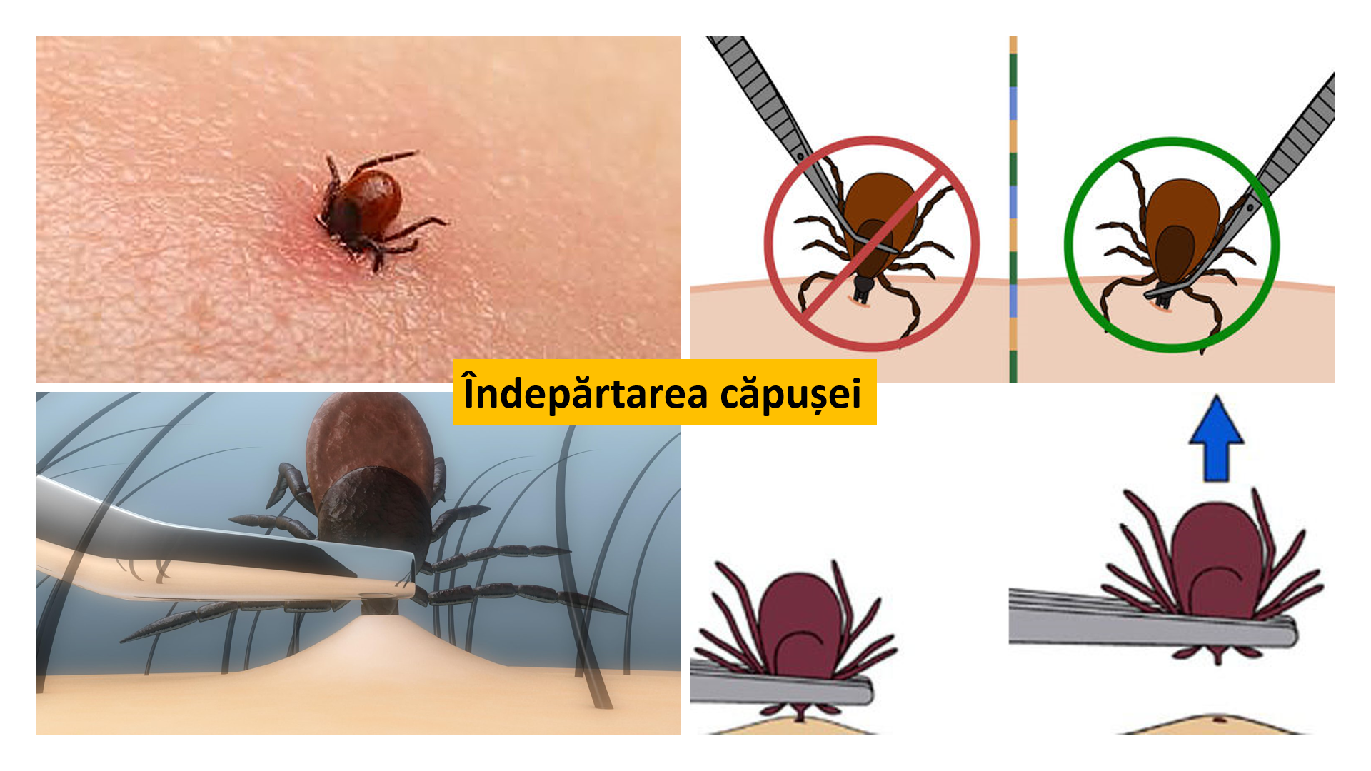 Se va utiliza o pensă cu vârf subţire, cu care se prinde căpuşa direct de la piele şi se va trage cu o forţă perpendiculară în sus (NU se roteşte căpuşa). Trageți FERM!