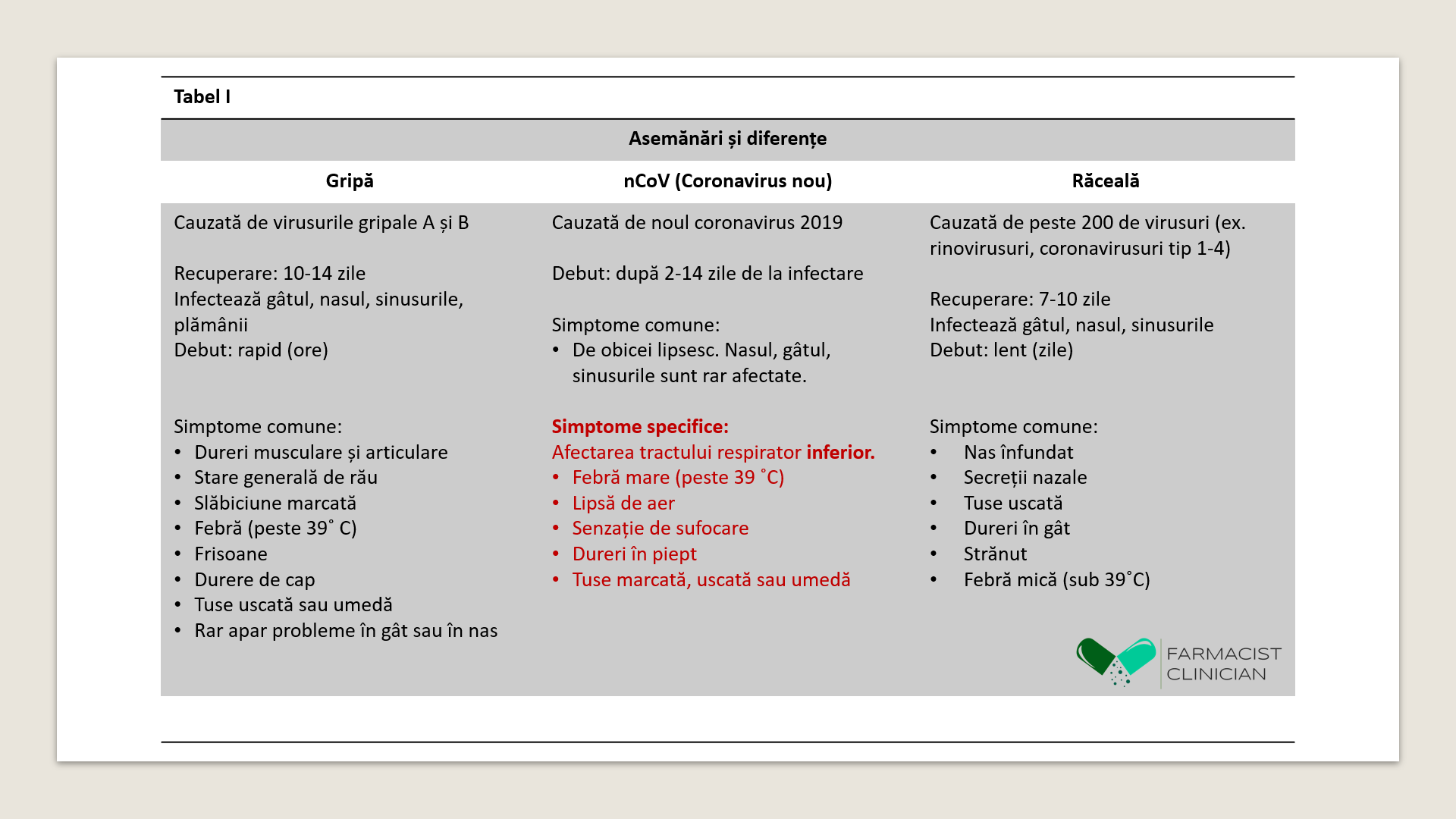Diferențe: Gripă vs. nCoV vs. răceală: Tabel I