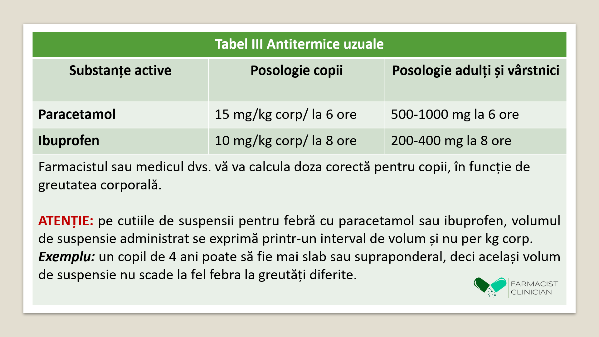 Tabelul III de mai jos conține cele mai uzuale medicamente antitermice și dozele recomandate: